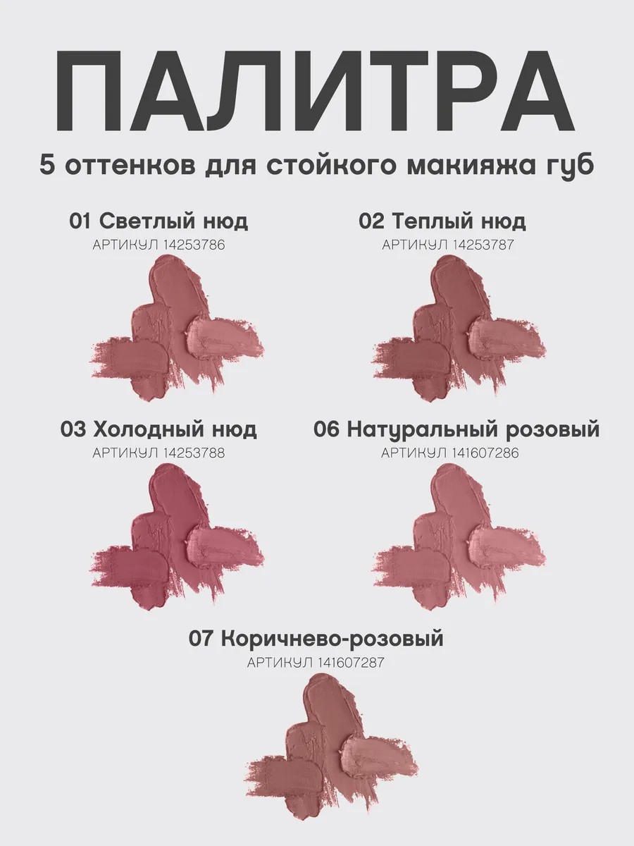 Характеристики Цвет: №07 КОРИЧНЕВО-РОЗОВЫЙ Объем: 1.35gr Описание Нежная кремовая текстура легко наносится, быстро фиксируется и не сушит губы. Устойчивая формула держится на коже весь день и не дает помаде и блеску растекаться. Универсальные насыщенные оттенки идеально дополнят любой макияж! Способ применения Очертите контур губ и растушуйте линию внутрь, чтобы мягко соединить с помадой или блеском. Или накрасьте карандашом всю поверхность губ.